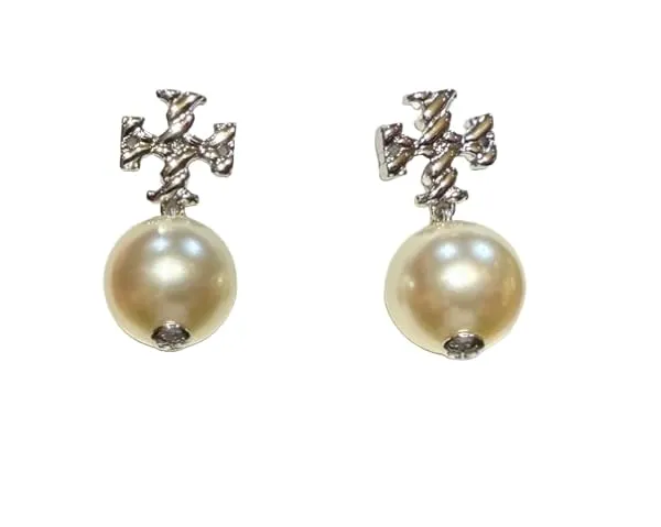 Design: Textured rope‑logo element (likely inspired by the Tory Burch logo) combined with a pearl drop for a classic yet modern silhouette.